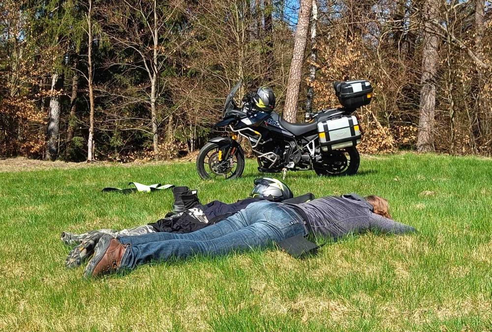 Pak si udělejte drobátko zajížďku směr Útěchovice a mrkněte na krásnou budovu staré papírny a mlýna. Pak zpět do Osečné a směr Zábrdí. Vyjeďte si na některou ze zdejších luk, nahoru k lesu, natáhněte se a relaxujte (teda pokud vám vyjde slunečno a dostatečné teplo jako nám 4.4.25). Poleženíčko jedna báseň (v Hamru ale koupel ještě nebyla).