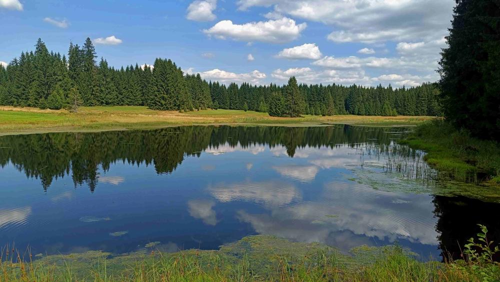 Přes Drahotín a Mutěnín do Hostouně, odtud do Bělé nad Radbuzou s první zastávkou. Tou je zdejší barokní most. Hodno chvály. Pak drsně na sever, krajinou líbezných cest a neméně líbezné krajiny. Silnice jsou zážitkem, nejsou zde záludnosti, přesto pestrý jízdní profil, provoz nulanula prd. Míjíme vobrovsky rozlehlý sady, kde jakýs knížepán pěstuje jabka, prý vyhlášená po celém kraji. Přes D5 do Tachova, zde zdálky obdiv zdejším hradbám a přes Lesnou hlubokými lesy na konec cesty, do Staré Knížecí Hutě. U zdejšího malebného kempu, který je až na jeden obytňák prázdný, přesto však oku lahodící místo, parkujeme. Strháme ze sebe motobrnění, vyměníme za procházkově laděný voblečky a deme. Jaj, to je nádhera, spolu v takto kouzelný krajině! Naším cílem je cca 7 km naučné stezky po zdejších sklářských hutích a provozech. Tady se to hodně podobá náhorním partijím Šumavy. Po pár km v údolíčku konečně první jezírko s černou rašelinitou vodou, ale čistou! Obnažujeme své kůže a vychutnáme si koupel. Slunce nad námi, mraky se líně plazí, někam. Pokračujeme a dozvídáme se, že na 4 km zdejšího potůčku bylo 9 sklářských provozoven či hamrů. To je neskutečný, jak lidé před námi dokázali využít krajinu a možnosti, které nabízela. Kam se na ně dnes se všema ajfonama a gůglama hrabeme. Chvíli kolem potoka, chvíli po starém náhonu, po troskách bývalých provozů, a přicházíme k torzu Arnoštovi leštírny. Leštírna? Ano, na ploché sklo. To ste nevěděli, že se sklo musí leštit? Já taky ne, ale díky místním nadšencům, kteří to doslova vykopali ze země, to už vím. Zdejší kraj byl převážně hraničním pásmem, kde se vše přebytečné odstřelilo nebo zplanýrovalo buldozerem. A přebytečné tu mimo dráty a vojcly bylo asi tak všechno. Dozvíte se, co byla stoupa, kde se nacházela, kolik vsí zde bývalo a dnes jsou po nich více či méně zřetelné zbytky zarůstající zdejší vegetací. Po krásným výšlapu, nádhernou krajinou, poučnými informacemi se vám ale usídlíi na hrudi jakýsi těžko, protože si uvědomíte hrůznou velikost nespravedlnosti, bolesti a utrpení. Vinící jsou různí, ale to trápení je strašný a trvalý.