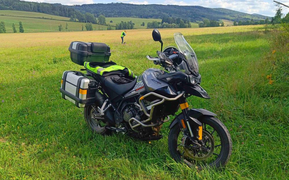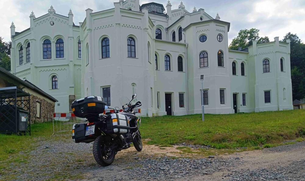 Teď trochu k mototématice. Krajina pod horama nebo přímo hory nejsou možná tak malebné jako Šumava, není zde ani tak velká tajemnost jako v Krušnejch, ale stejně nás to posadilo na zadek. Podhůří je plný luk, remízků, polí, lesů, vesniček či městeček. Je to protkaný sítí příjemných silnic, krajina je hezky oblá a dá se v ní moc hezky kolíbat, při jízdě, a nikoliv po nadměrnym požití. Provoz byl minimální, asfalt v podhúří dobrej. Jakmile vjedete víc do hor, vše se zúží. Silnice, pohledy, rozpoložení. Cesty jsou místy horší (ty óbr nejhorší rači vůbec nepopisuju, páč během jízdy po nich sem mohl vobčas zadkem stříhat roxory = hluboký díry, spousta štěrku a písku, vytahaný veliký kameny; asi kdybych jel sám nalehko, tak to nebudu tak prožívat, ale ve dvouch a naložený to je něco jinýho). Občas takový zvláštní trudno, kerý je možná vyvolaný tím, že toto byla země péésáků (pohraniční stráž) a žerty se tu moc nevedly. Je určitě vyvolaný tím, že na vás padne odraz doby války, vyhnání Čechů, po válce Němců a pak dráty pod proudem. Projíždíte neskutečným množstvím zaniklých obcí označených zelenou tabulkou s názvem. Jenže pak vjedete do místa, kde vás obejme výhled do laskavé krajiny a zahřeje vaše srdce i mysl. Spousta krásných exemplářů stromů, smrky, platany, jilmy, javory, buky, břízy, třešně. Dále rozlehlé louky, mnohdy se spoustou květů (a to byl závěr srpna). Soliterní stromy v polích a lukách, bohatá stromořadí kolem cest, meze, remízky, mech, kapradí, prostě ta pravá rozmanitost, jak má být.