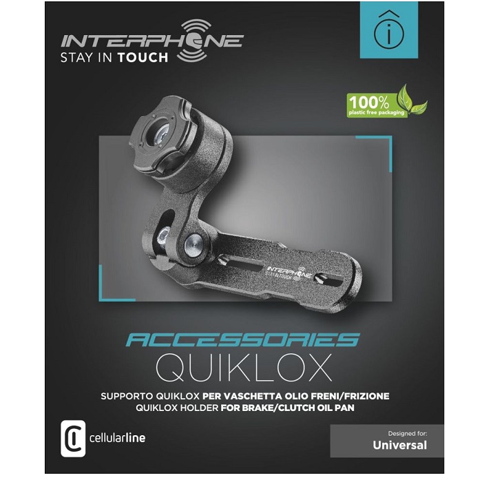 Úchyt Interphone QUIKLOX s novým rychloupínacím systémem, který vám umožní mít váš mobilní telefon stále s sebou. Jedná se o univerzální úchyt na víko nádobky brzdové / spojkové kapaliny. Je tak ideálním a pohodlným řešením pro maxiskútry, skútry nebo motocykly, které nemají místo na řídítkách. Hlavice úchytu je vybavena speciálním systémem QUIKLOX. Kompatibilní se všemi kryty, držáky a pouzdry QUIKLOX nebo adhezivní základnou SMQUIKLOXPAD, která se instaluje na záda telefonu. Po přiložení telefonem jednoduše pootočíte a zajistí se tak pevně k úchytu. Stejně rychle pak telefon po skončení jízdy odepnete. Sklon ramene úchytu si můžete upravit podle potřeby.
