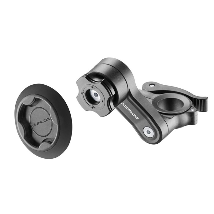 Sada rychloupínacího držáku s úchytem na řídítka a adhezivní základny Interphone QUIKLOX vám umožní mít váš mobilní telefon pohodlně a bezpečně po ruce během jízdy na motocyklu. Jedná se o univerzální držák vhodný pro tubulární řídítka, přizpůsobí se různému průměru. Hlavice držáku je vybavena speciálním systémem QUIKLOX. Ten funguje ve spolupráci s adhezivní základnou SMQUIKLOXPAD, která se instaluje na záda telefonu. Samotnou základnu přilepíte pomocí 3M pásky k zádům vašeho telefonu nebo zadního krytu. Instalace základny je snadná a rychlá a díky minimální tloušťce nijak nevadí při běžném používání telefonu. Po přiložení k držáku telefonem jednoduše pootočíte a ten se tak zajistí pevně k držáku. Stejně rychle pak telefon po skončení jízdy odepnete. Sklon ramene držáku si můžete upravit podle potřeby.
