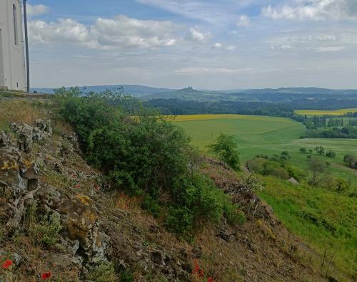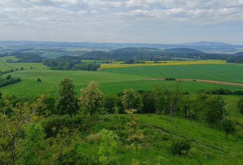 Už sme byli trochu ve skluzu (naštěstí jen časovém), takže v Žehrově sme odbočili vp, ale příště odbočíme nejprve vl a dojedeme do místa, kerýmu se říká V Dubech – nádherná zatopená louka s dubama, takže to klidně vomrkněte před náma. Po úzké silničce přes Skokovy, mezi loukami a lesy, nahoru a dolů, plno drobných zatáček (teda i vostrejch, ale úzkých). Při toiletpauze sme v dáli viděli špičatej kopec s kapličkou, no a do 15´sme byli u něj. Ves Vyskeř, krátká zajížďka do kopce a pak po svých nahoru na vyhlídku. Sice sme funěli jak dvě parní mašiny, ale ten výhled kol dokola stojí za to. Zastavte tu a děte se pokochat. Drábský světničky, Bezděz, Ralsko, Ještěd, Krkonoše, Kozákov, Trosky. Todle šecko uvidíte, a eště víc.
