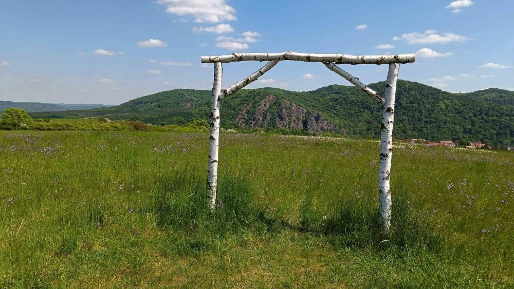 To ale už jedem po 201 přes vesnice s lahodně českými názvy jako sou: Kozojedy, Brodoslavy, Všehrdy, Holovousy, Chříč, Slabce a další. Skoulíte to serpentinama k Berounce, jen co se s ní seznámíte se opět loučíte a frčíte směrem nahoru. Před Týřovicema sem si udělal zajížďku vlevo nahoru kamenitou polňačkou na plochý vršek s březovou bránou, kterou dohlídnete na protější skály a do okolí hradu Týřov, kde sem porád eště nebyl, ačkoliv to je jeden z největších gotických hradů u nás. Tedy byl, hrad francouzského kastelového typu s mnoha ježícími se věžemi. Tak třeba někdy příště. Na vyhlídce mě uchvátili kopretiny a zvonky. Nebyl sem tam sám, švitořily tam stovky ptačích zpěváků mnoha jmen.