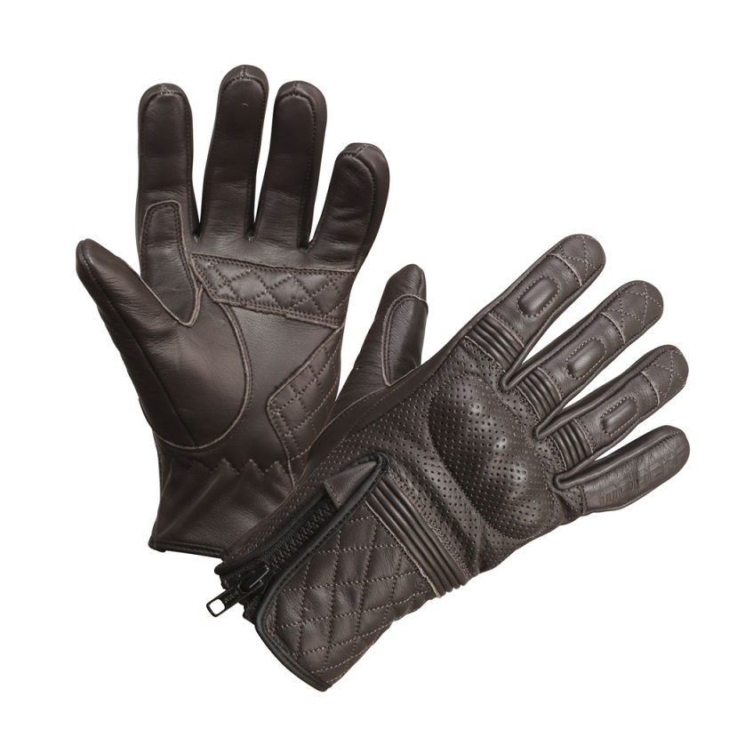 Motocyklové rukavice Modeka Parkar. Rukavice na motorku, model Parkar, jsou ušité v klasickém Caferacer stylu z pravé hovězí kůže. Speciální úprava pro ovládání dotykového displaje (navigace, telefon, ..) zapínání na zip.