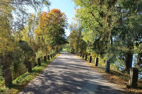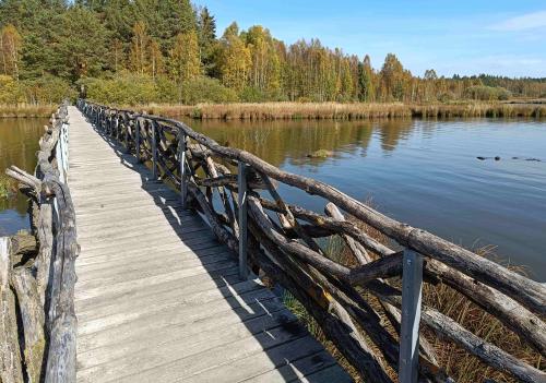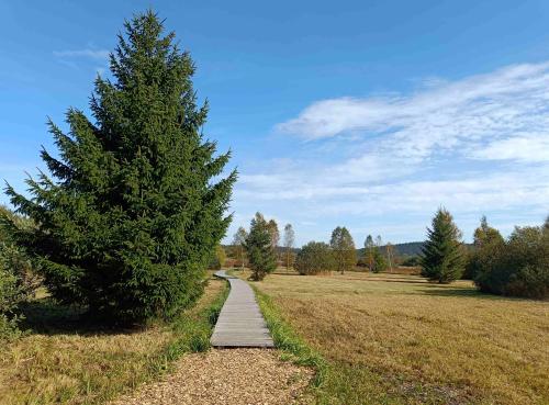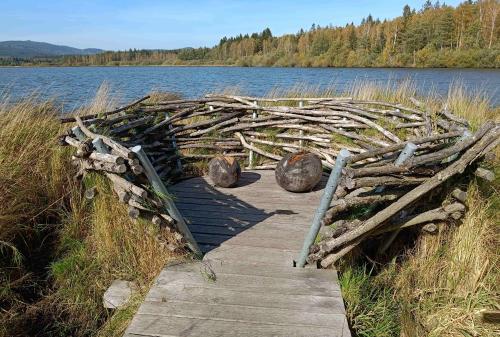Trasa nás vede po hranici vojenského prostoru přes zaniklé vesnice ryzí šumavskou krajinou. Je to fulkochačka s relativně malým provozem v první třetině štreky (pozor jen na nenadálé výjezdy tanků a otéček zprava, óne sranda!!!). Když chytnete azuro jako my, tak to je neskutečná krása a je škoda zde otevírat škrtící klapku bajku. Lesy, louky, výhledy, horizonty. Když sjedete k resortu Olšina, tak před „íčkem“ nechte stroj a jděte se podívat dovnitř, k rybníku nebo si zde dejte něco dobrýho v restauraci. Pokud budete mít trochu vyhovující boty a dostatek pěší chuti, udělejte si prostor na osm kilometrů nádhery v podobě naučné stezky Olšina. Nebojte se zout a víc jak polovinu jít bosí jehličím a povalovými chodníky, je to lábuž!!! Obejdete celý rybník, blízká rašeliniště a lesy. Pokud nebudou na vedlejším vojenském újezdě naplánované střelby, tak si užijete i božskýho klidu (my měli to štěstí, že cca hodinu nad námi v intervalu necelých 10´kroužil bitevník Albatros nebo Alca v kamufláži některého z pouštních států, doprovázený raketovým dronem velikosti menšího letadla; když zalétli za val blízkých hor, spustili kanonádu a za chvíli se nám zase dostali nad hlavu). Nobody its perfekt, takže stejně to je čarokrásná cesta. Po hrázi se vrátíte zpět k restauraci (jídlo bylo výborný, lidí pár, jenže to byla polovina října). V hotelu nebo bungalovech lze i přespat, jen to prý stojí vo trochu víc grošů.