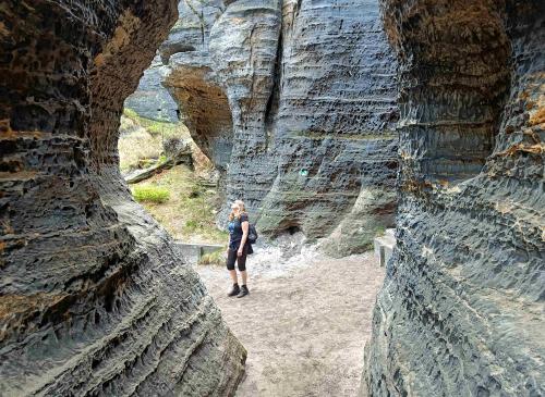 Vzali zme to Kyjovským údolím, přes Jetřichovice, vedle „Růžáku“ přes Ludvíkovice do Děčína. Pře Labe, za mostem hnedka vpravo dolu, přes trať a pak krpálem přes Jalůvčí, krásnejma lesama za Sněžník, odtud vpravo a po pár km na P pod Chatou Tisá. Páč nejsme klasický bajkeří, ale moto berem taky jako prostředek k návštěvě hezkejch míst, kerý si chcem procournout, měli zme všechny kufry a lehký oblečení na chození s sebou. Převlíkli zme se (boty máme univerzály na moto i chození, ale nejsou to echt motoboty = planiky a lehký kanady) a motovýbavu uložili do kufrů. V chatě nad náma zme dali polévku a pivo, no a šli zme. Teda, nádhera a krása. Jen sem nepočítal, že se platí vstup do skal, ale co je dnes zadáčo? Pomálu uš nic. Aspoň sme k lístkům dostali průvodce s popisem významných skalních útvarů, což bylo fajn. Lze udělat okruh Velkými stěnami, na něj navazuje okruh Malými a zelenou po hraně skal se vrátíte k chatě. Dohromady cca 4-5 km, nastoupáte 180 m, a to samý sklesáte. Skály z pískovce, přesto místy dost do černa, občas železitý žilkování; přehršle různých tvarů a někdy i zajímavý barvy. Mezi tím pískový pěšiny, kdo chce může se tu uprolejzat skrze ty skály a vočumovat tu krásu co hrdlo ráčí. Někde se leze, takže lze vočíhnout i tohle. Z vyhlídek nahoře na skalách je paráda pohled na kraj. A k tomu březový háje, zelený borůvčí. A překvapivě dobrý jídlo v chatě nad P a s ohledem na exkluzivitu místa není přehnaně drahý.