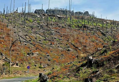 Zpět kochačka největší, přes Děčín a Kamenici, Pekelským Dolem přes Kunratice do Studeného, zde malé občerstvení z vlastních zásob. Zpět na začátek Chřibské a krásným, leč kůrovcem dosti vyhlodaným údolím přes Brtníky zpátky do Mikulášek. Stále jsem motoamatér, za Studeným mě překvapila hodně úzká silnička s proklatě zakroucenýma serpentinama. Měl sem premiéru, bo sem dolů musel jet ty zatáčky vykotlaný ve skále na pomalou jedničku, trochu si zaspojkovat a tvrdě se držet vpravo. Nebylo tam vidět a silnice široká tak na dvě babety vedle sebe, ale to se k sobě musej tulit! Ovšem vzato venkoncem, silnice a silničky ve Šluknovsku nás nadchly. A ty panorámata, Ludánku!!!