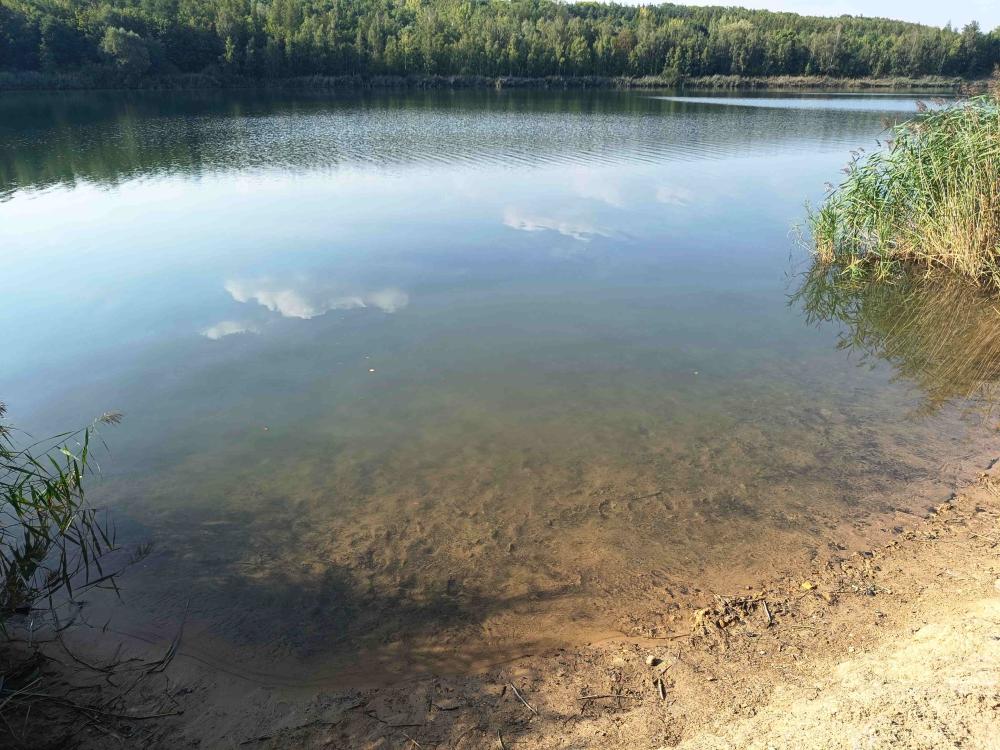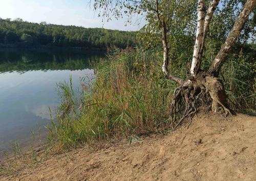 Přes Novou Ves v Horách sjedete dalším parádním úsekem, bukovým lesem do Horního Jiřetína. Pak sme si odskočili na jídlo do Oseka a odtud na braňanskou pískovnu. Byl sem tu před 10 lety, z vody a poležení pod břízami sem byl tenkrát nadšenej. No a světe div se, na to nadšení jsme mohli navázat. Voda fajn, motorkou lze dojet blízko vody, takže žádný strach o kufry plný věcí. Voda a horko k sobě prostě fajn pasujou.