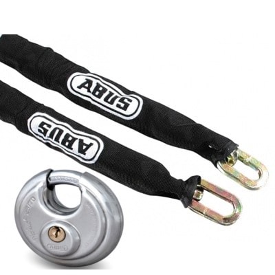 - Kombinace visacího zámku a řetězu z tvrzené oceli (délka 2m. průměr oka 10 mm)